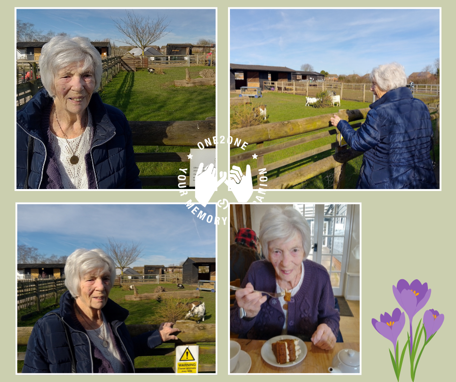 Sheila and her ‘Memory Companion’ Kerry had a lovely time in the sunshine at Lathcoats Farm. Sheila enjoyed a huge piece of carrot cake with her cup of tea before they headed out for a walk around to look at the animals.